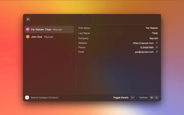 Disclaimer: This is not an official HubSpot product. It is a raycast plugin created by a third party and may not accurately reflect the features and capabilities of HubSpot products. Please refer to the official HubSpot website for accurate and up-to-date product information.
