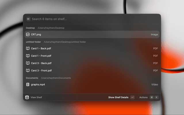 View ShelfView ShelfBrowse shelf items (grouped by folder), search, see stats, and run item actions: Show in Finder, Open With, Copy Path, Remove. Shelf actions: Copy All, Move All, Rename All, Clear Shelf.