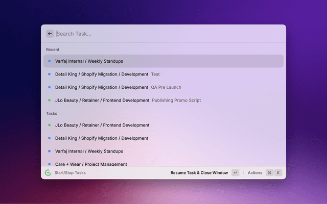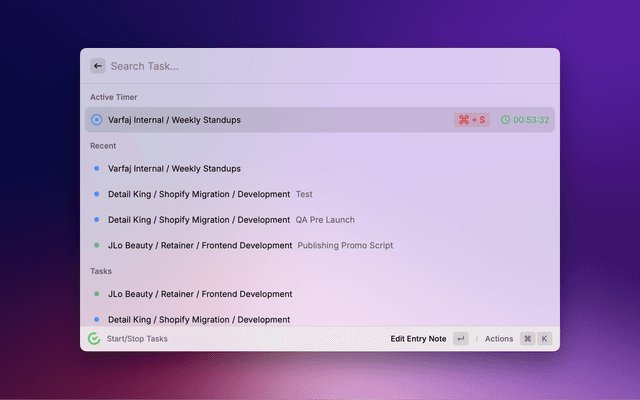 ENTER: Open form to edit the timer.CMD + S: Stop the timer.ENTER: Start the timer for the task with the same task note/description and close Raycast.CMD + S: Start the timer for the task with the same task note/description.ENTER: Start the timer for the task and open form view to edit the note/description for the timer.CMD + S: Start the timer for the task.This view is used to edit the active timer info.