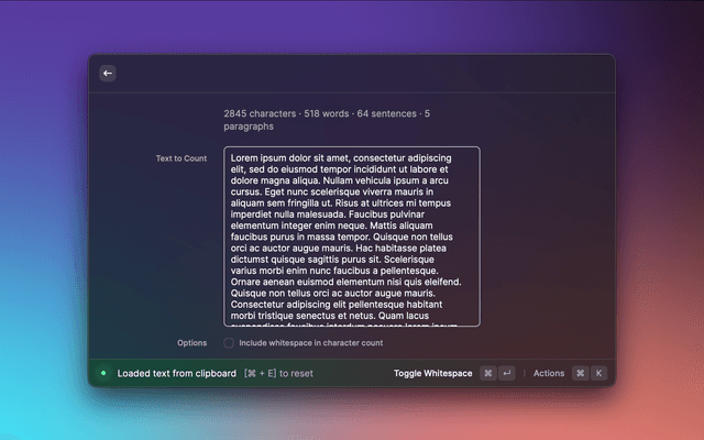 • The command will automatically count any text in your clipboard. To clear, use ⌘ + E.