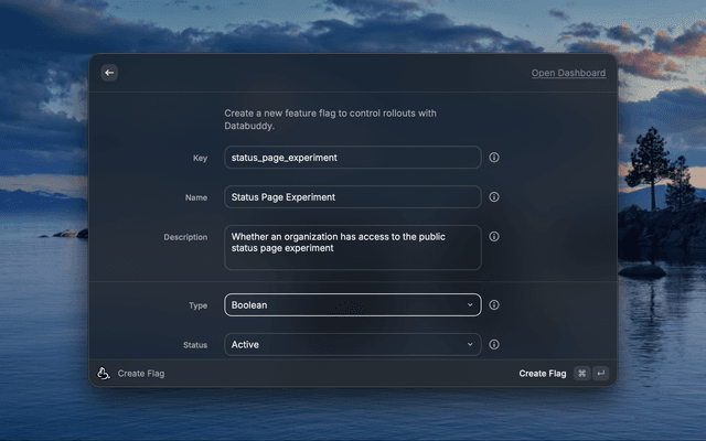 • Create Flag — Create a new feature flag with type, rollout percentage, and environment targeting