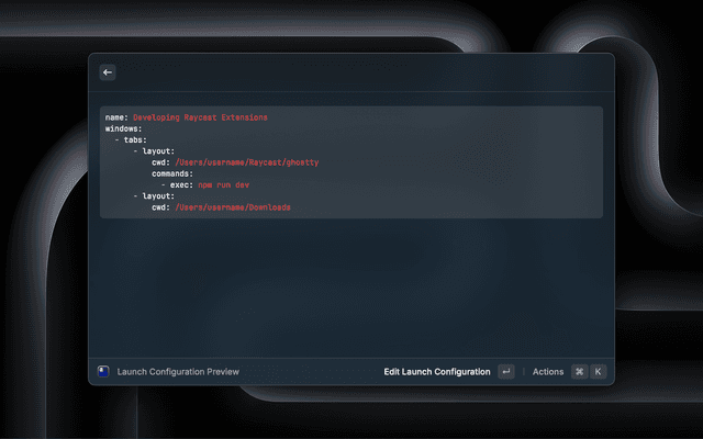 Launch configurations let you quickly open Ghostty windows, open tabs, navigate to folders and enter commands. They're inspired by Warp's launch configurations. If you had already created a launch configuration in Warp, you can copy it into this extension.