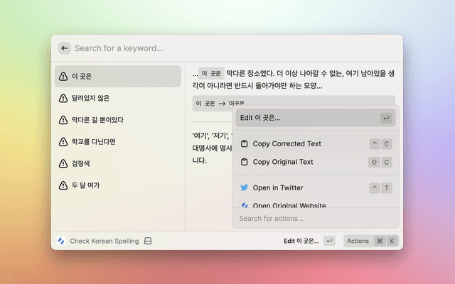 Click Actions on the right corner or press cmd+k to see actions you can do. You can correct your errors, copy the original/corrected version of text, and even open twitter with corrected text!