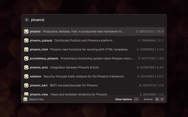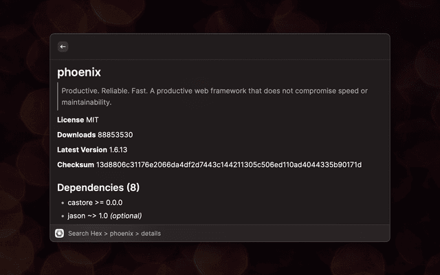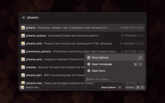 This is a Raycast extension that enables you to quickly look up package information from Hex.