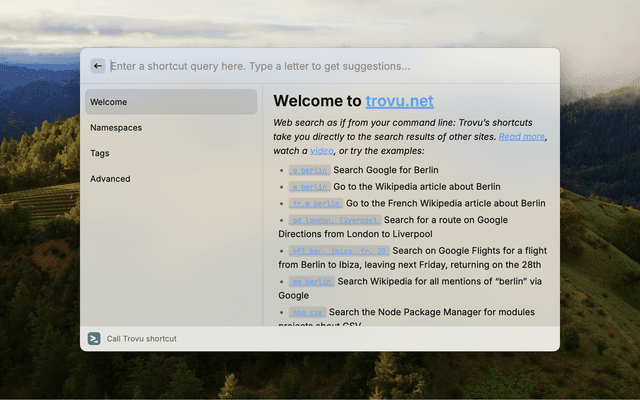 Search 1000+ websites in a command-line way, with curated and personal shortcuts, organized by namespaces, allowing multiple and typed arguments, with full privacy.
