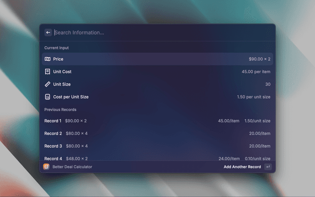 Better Deal is a quick calculator for online shopping where it calculates the better deal between two options, taking into account the price, quantity, and unit size. It also stores the five most recent records for future reference.