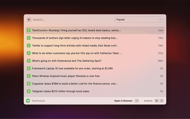 This is a simple extension that allows you to read TechCrunch news. It works directly in Raycast, no external applications or dependencies are required