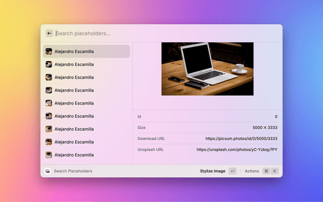 If you find an image you like in the Search Placeholder Image command, you can use the Set Desktop Wallpaper action to set it as your desktop wallpaper.