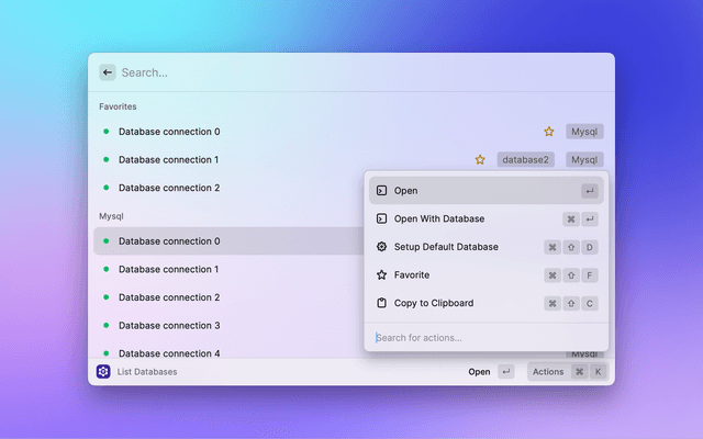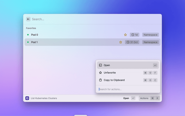 Interact with Teleport from Raycast. Open a database connection directly in your default database client or connect to a server via SSH in your preferred terminal. List your Kubernetes clusters and pods and open your applications in the browser.
