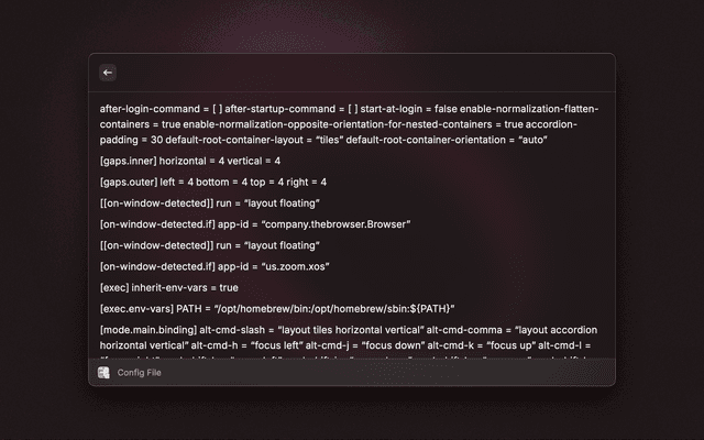 • View all shortcuts parsed from your config file (loads the config path using aerospace config --config-path)