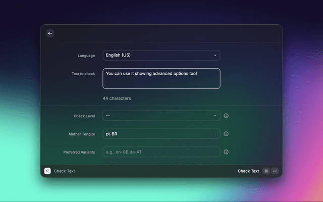 Instant spelling and grammar correction using LanguageTool API. Get real-time suggestions and improve your text quality in multiple languages.