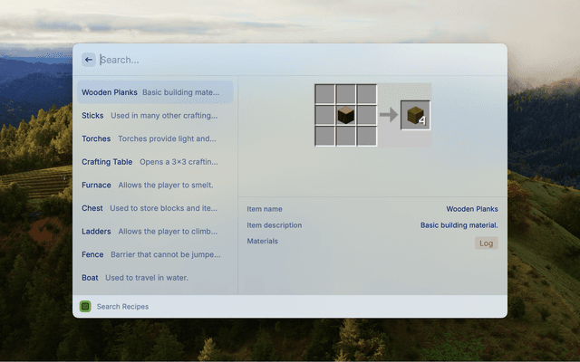 Quickly find recipes for Minecraft crafting.
