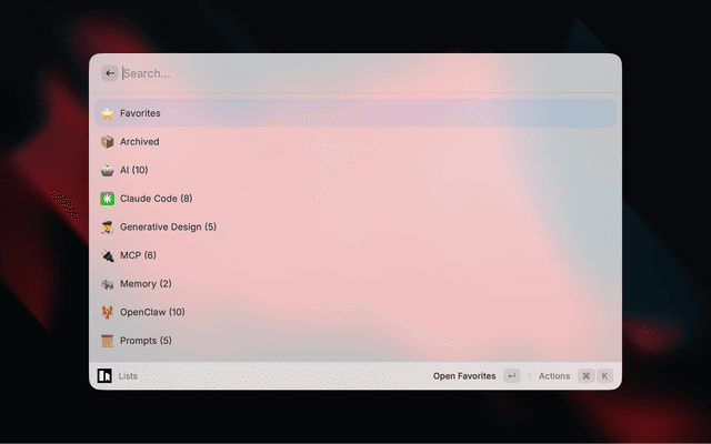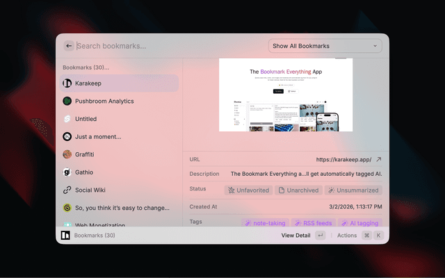 • Intuitive Search: Quickly locate any bookmark or content using the online search feature of Karakeep and the powerful search capabilities of Raycast.