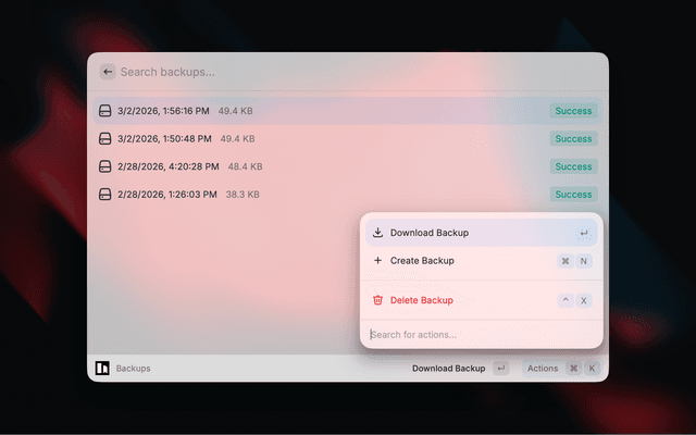 • Backups — Create, download, and delete account backups. Backup status updates automatically — the list polls while a backup is in progress.