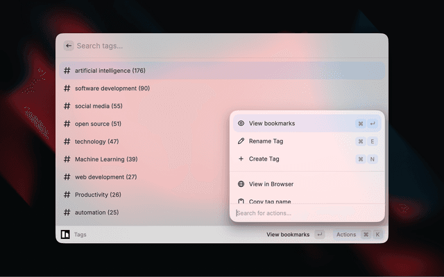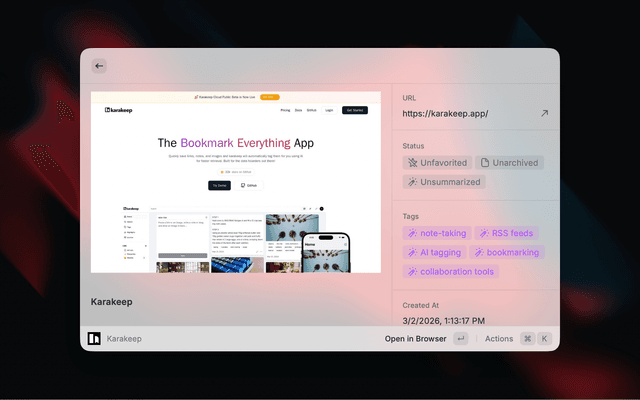 A Raycast extension for Karakeep, a self-hostable bookmark manager with AI-powered tagging. Save, search, and manage your bookmarks, notes, and highlights without leaving Raycast.
