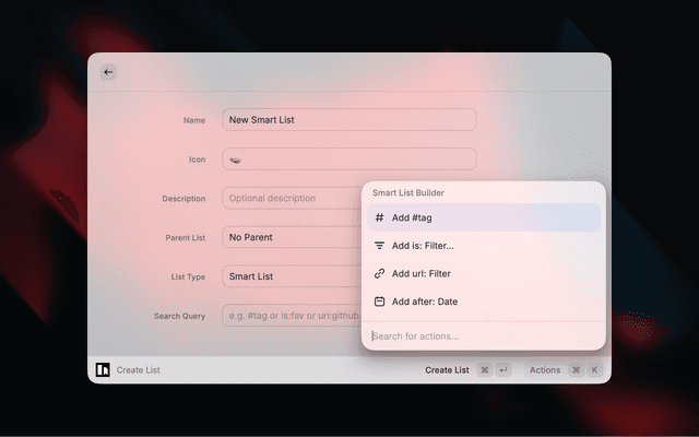 • Create Bookmark — Add a new URL bookmark, optionally prefilled from your active browser tab.