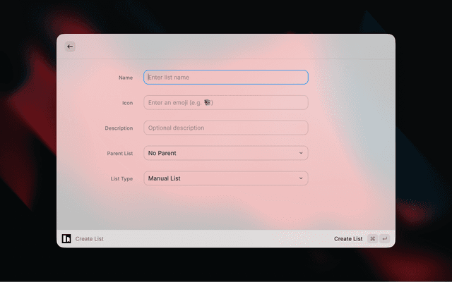 • Lists — Create, edit, and delete lists including smart lists with query-based filtering.