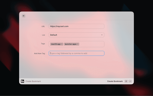 • Fast Bookmark Creation: Create new bookmarks directly from Raycast with just a few keystrokes