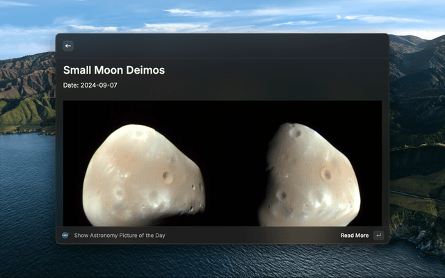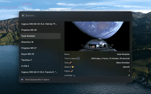 This Raycast extension allows you to view the Astronomy Picture of the Day, latest news, astronauts, spacecrafts, and upcoming launches from NASA and other space agencies.