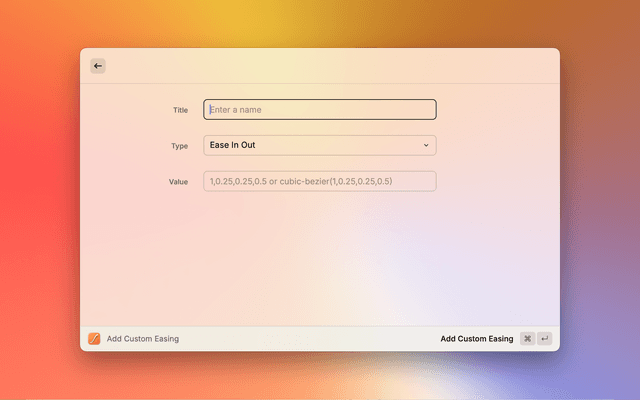 - Built-in Easings: Access to common cubic-bezier easings (ease-in, ease-out, ease-in-out)