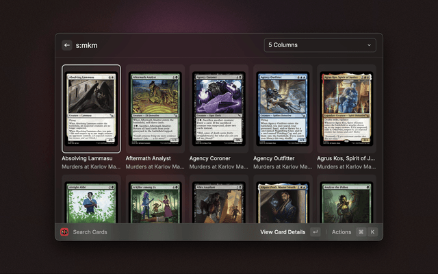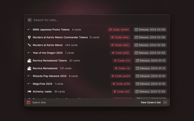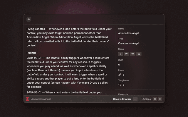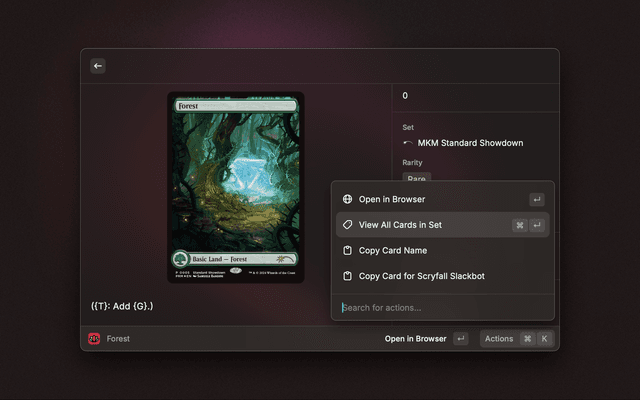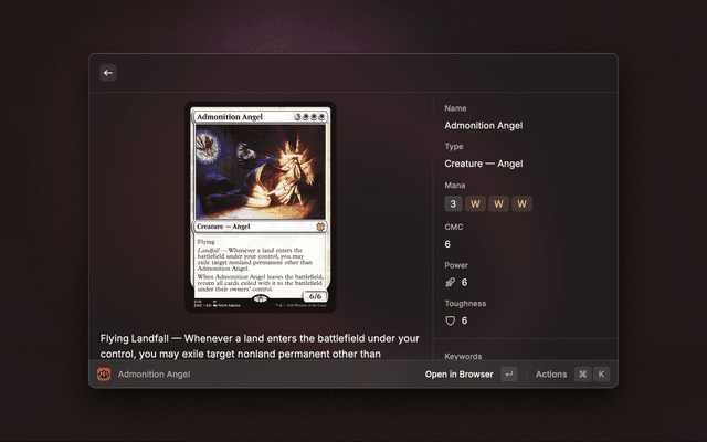 A non-official tool for Raycast to easily search for Magic The Gathering cards, sets, and rules - powered by Scryfall search.