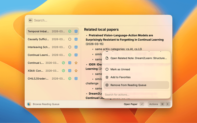 | Reading Queue | Papers you’ve queued for reading. Stored locally; same open/read/favorite actions. |
