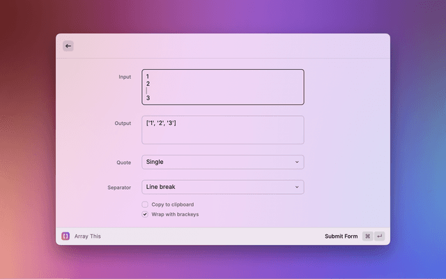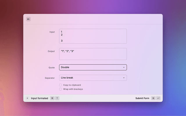 Raycast extension to format list of items into an array.