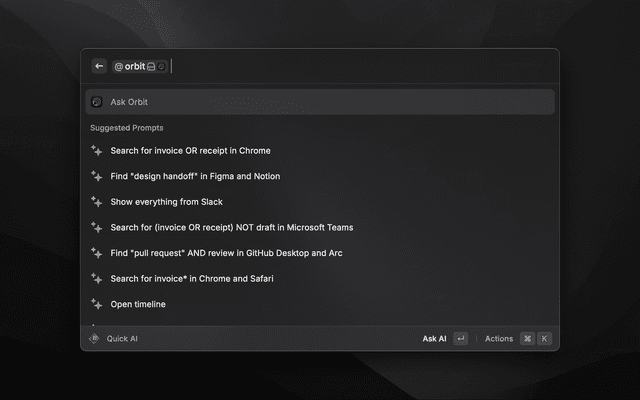 • Opens Orbit search with your query, showing results from your screen history.