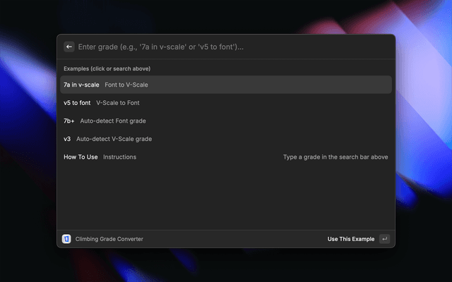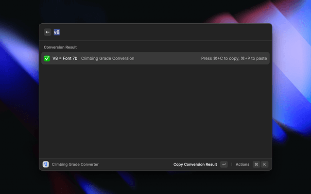 This is an extension for raycast that converts any climbing grade (Font e. 7b+, V-scale e. V8, and YDS e. 5.14a) into a selected one, using natural language.