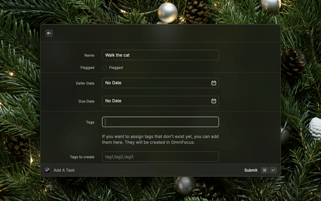 Add a task to OmniFocus with additional options like: