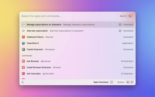 • Subwatch - Raycast Key - This is your personal API key, it's available to every paid user of Subwatch. To get it head over to the Subwatch extension or app -> settings and copy the raycast key from its section. Insert it in the Raycast Subwatch - Raycast Key configuration.