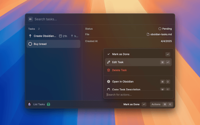 A Raycast extension to manage your Obsidian tasks from your menubar, with full support for the Obsidian Tasks Plugin format. This extension is specifically designed to work with the official Obsidian Tasks Plugin, maintaining complete compatibility with its task format and features, but it can be used without it too.