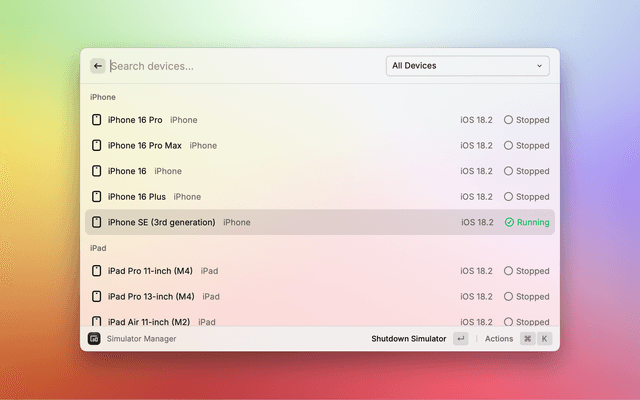 Easily manage iOS simulators and Android emulators directly from Raycast.