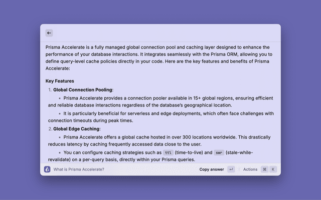Provides a way for you to use the "Ask AI" feature of Prisma's Documentation from with Raycast. Handy if you are heavy into dev work and want to query the Prisma documentation using a few keystrokes.