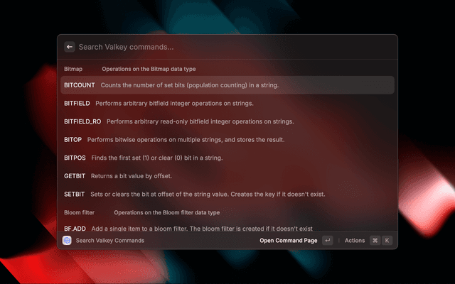 The extension provides easy to access searchable list of Valkey commands. On selecting a command the extension opens the command's documentation on Valkey website.
