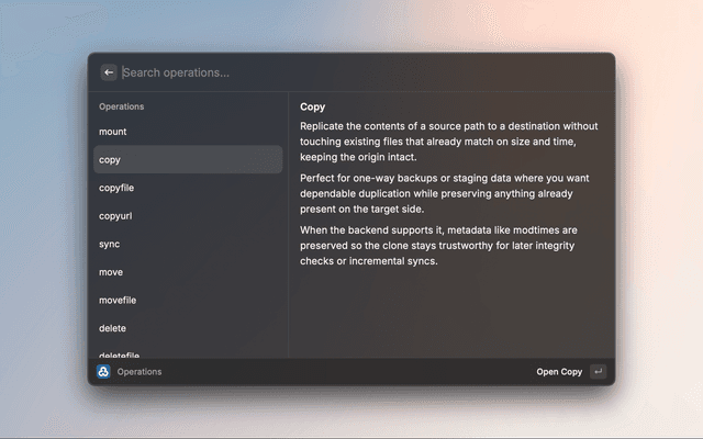 • Operation catalog – run mount, copy, copyfile, copyurl, sync, move, movefile, delete, deletefile, and purge with forms that prefill flag defaults from your global rclone config.