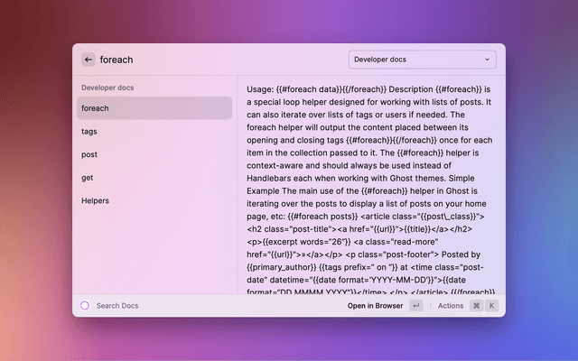 Search Ghost help center, developer docs, tutorials, changelog, and publisher resources right from Raycast!