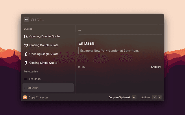 Find the correct typographic character — curly quotes, en dash, mathematical symbols, and more — without remembering keyboard shortcuts. Copy and paste the character or its HTML entity for prettier typography.