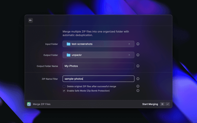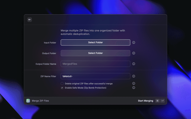 Intelligently merge multiple ZIP files into a single organized folder with automatic deduplication. Perfect for Google Takeout archives, photo collections, backups, and any batch of ZIP files.