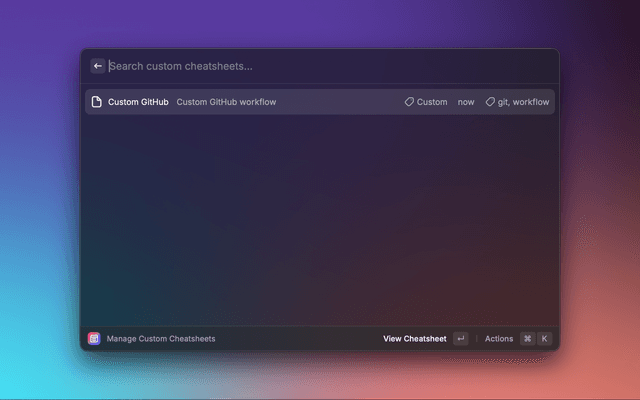 Access a curated collection of DevHints cheatsheets plus the ability to create and manage your own custom sheets - all without leaving your keyboard. You can also import Markdown cheatsheets directly from your GitHub repositories and keep them up to date via a built-in Repository Manager. Search is smart and fast, prioritising titles over content so you find what you need instantly.