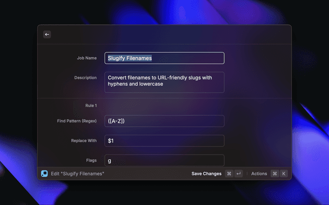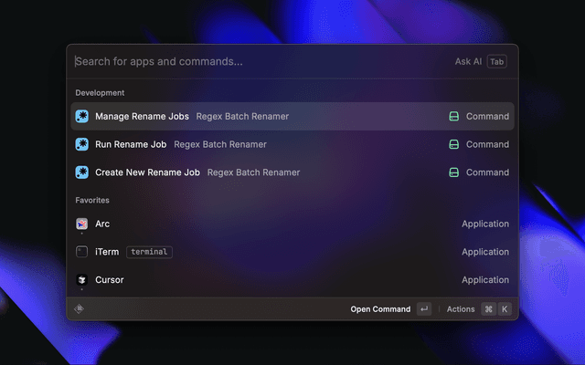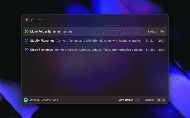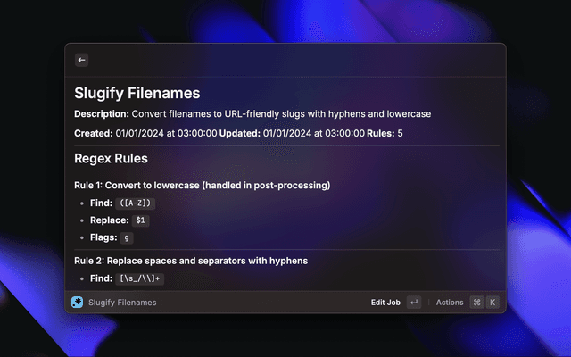 A powerful Raycast extension that allows you to create and manage multiple regex-based file and folder renaming jobs with batch processing capabilities.