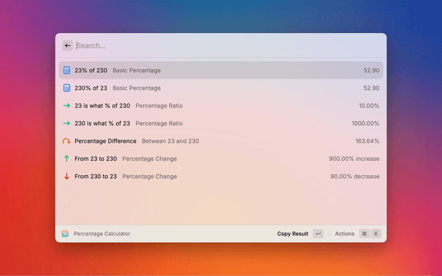 A comprehensive percentage calculator for Raycast that provides a Full Statistics view with colorful card-based results. Enter any two values and get a complete breakdown of all possible percentage calculations in one go!