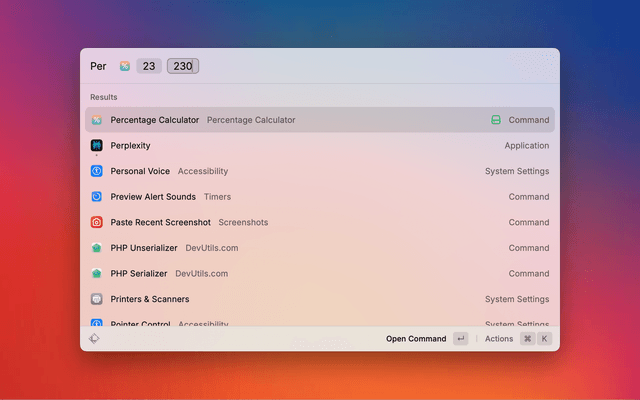 • Type "Percentage Calculator" or "perc" in Raycast