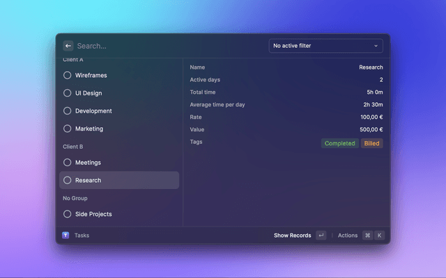 🔎 Search your time records 📋 Copy and paste fields 🆕 Create new tasks ⏯︎ Start/Stop tasks