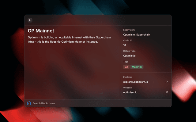 • Search Blockchains: Find blockchains by name, description, ecosystem, and more
