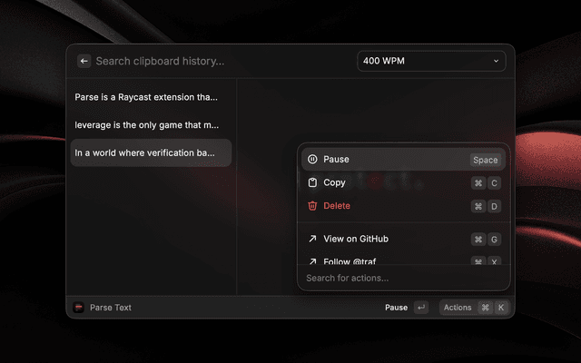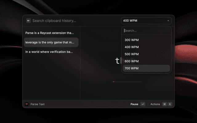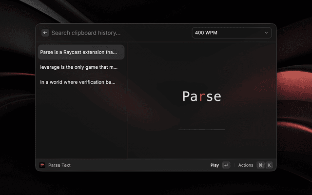 Parse is a Raycast extension that lets you speed read any copied text using RSVP (Rapid Serial Visual Presentation) technique.