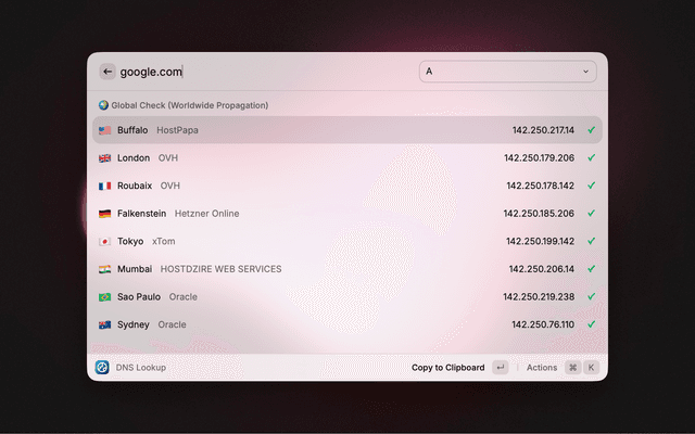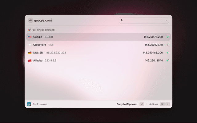 DNS Lookup for Raycast is a powerful, zero-config tool designed for developers and sysadmins. It offers two modes: a Fast Check for immediate debugging via DoH (DNS over HTTPS) and a Global Check to verify worldwide propagation using physical probes via the Globalping network.