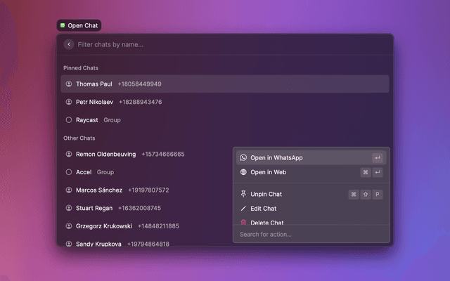 At the time of writing this, WhatsApp does not offer a public API for users. It only provides application links to quickly access already existing chats. Until WhatsApp provides a public API, the Add Chat and Add Existing Group commands will serve for adding the chats to the extension so users can access them from the Open Chat command.