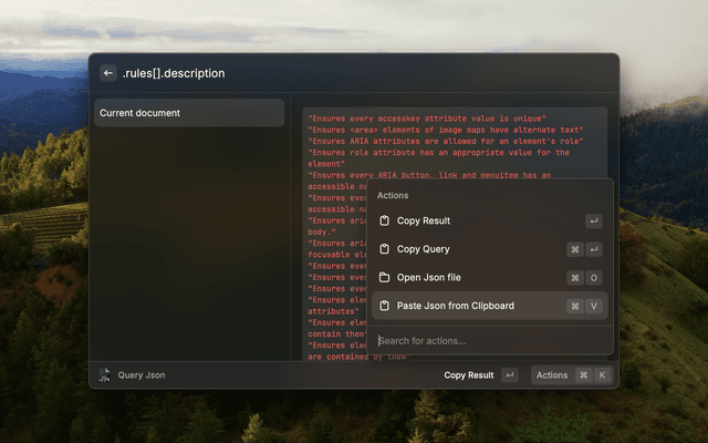 As simple as opening Raycast, typing jq and pressing ⌘ + V to load JSON content from clipboard or ⌘ + O to open Finder and select a file.