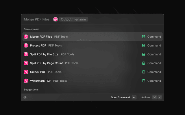 The PDF Tools extension for Raycast streamlines PDF manipulation tasks with commands that will save you time and effort, letting you focus on what matters most in your productive routine.